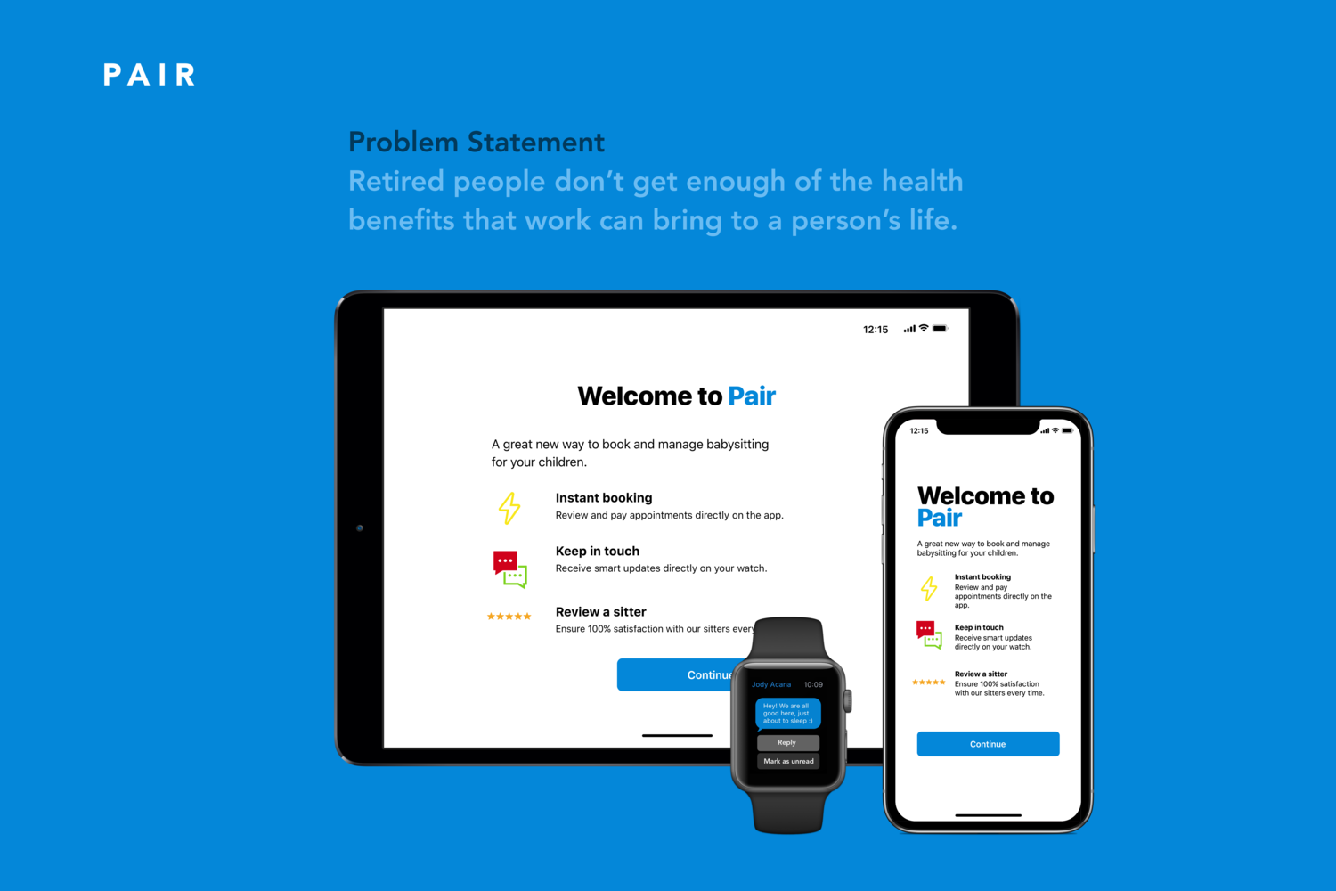 Over the span of a week, the conceptual app "Pair" was prototyped and pitched to a panel of mock investors.